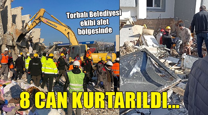 Torbal? Belediyesi 10 ki?ilik bir ekiple depremin ikinci gününden itibaren Hatay’da yaralar? sarmaya devam ediyor.  ?zmir Büyük?ehir Belediyesi ile koordineli bir ?ekilde hareket eden ekip, bugüne kadar 8 vatanda??n enkazdan sa? ç?kar?lmas?nda rol ald?.