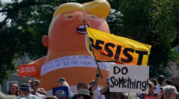 Protestolarda kullan?lan pankartlarda “Irkç? Trump”, “Trump’? geri dönderin” ifadeleri yer al?yordu. Ohio’da en az 200 ki?inin kat?ld??? protesto ise Trump ile e?i Melania Trump’?n ziyaret etti?i hastanenin önünde gerçekle?ti. Pankartlar?n yan? s?ra üzerinde “Bebek gibi davranmaktan vazgeç!” yazan “bebek Trump” balonu dikkat çekti. Eylemciler Trump’? ?rkç? söylemi ile ?iddetin yolunu açmakla suçlad?.