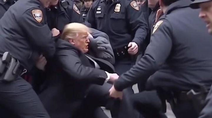 Gerçek olmayan foto?raflarda Trump, New York polisi taraf?ndan gözalt?na al?n?rken görülüyor. Bir di?er foto?rafta ise Trump’?n e?i Melania Trump öfke içinde hayk?r?rken görülüyor.