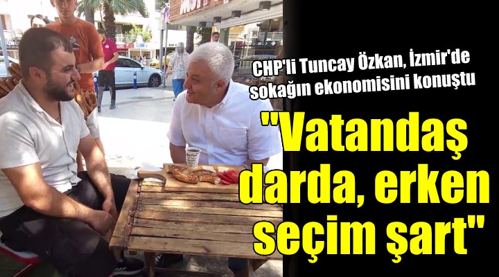 CHP Genel Ba?kan Ba?dan??man? ve ?zmir Milletvekili Tuncay Özkan, ?zmir Alsancak’ta soka??n ekonomisine dair belli aral?klarla sohbet etti?i simitçi Rojhat Akçakale'nin tezgah?nda kahvalt? yapt?. Akçakale'ye fiyatlar?n ve i?lerin durumunu soran Tuncay Özkan, sohbete ili?kin videoyu sosyal medya hesab?ndan "Vatanda? darda, erken seçim ?art! Bu kahvalt? sofras? 15 TL: Dilim peynir, domates, gevrek ve çay" notuyla payla?t?.