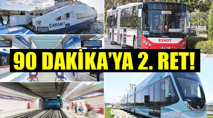 ?zmirlilerin yeniden 90 dakikal?k ücretsiz aktarma sistemiyle bulu?mas?na ula??m kurumlar?n?n yan?nda farkl? kurumlar da ret oyu verdi. 90 dakika; ?l Jandarma Komutanl???, Ege Ordusu ve Garnizon Komutanl???, Sahil Güvenlik Ege Deniz Bölge Komutanl???, ?zmir ?l Emniyet Müdürlü?ü, Karayollar? Genel Müdürlü?ü 2. Bölge Müdürlü?ü, TCDD 3. Bölge Müdürlü?ü, TCDD Ta?. A.?. ?zmir Bölge Müdürlü?ü, DHM ??l. ?zmir Adnan Menderes Havaliman? Ba?müdürlü?ü, Ula?t?rma ve Altyap? Bakanl??? Altyap? Yat?r?mlar? Genel Müdürlü?ü, Ula?t?rma ve Altyap? Bakanl??? Ula?t?rma Hiz. Düz. Genel Müdürlü?ü 3. Bölge Müdürlü?ü, ?zmir Bölge Liman Ba?kanl???, ?zmir ?l Milli E?itim Müdürlü?ü, ?zmir Aile ve Sosyal Hizmetler ?l Müdürlü?ü, ?zmir Çevre, ?ehircilik ve ?klim De?i?ikli?i Müdürlü?ü ve ?zmir Afet ve Acil Durum Müdürlü?ü’nün olumsuz oylar?yla reddedildi.