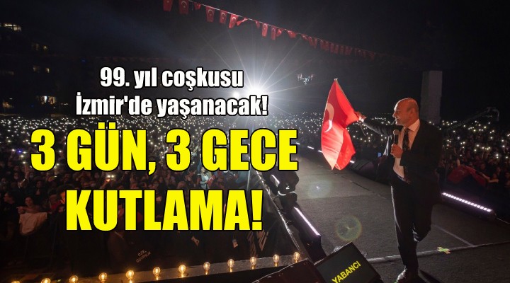 ?zmir Büyük?ehir Belediyesi, 99. y?l?nda Cumhuriyet’e sahip ç?kman?n gururunu ?zmirlilerle payla?acak bir program haz?rlad?. Resmi törenlerin yan? s?ra kentte üç gün üç gece Cumhuriyet Bayram? kutlanacak.