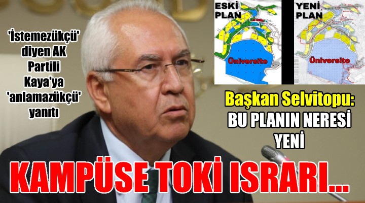 Kampüs arazisinin tamamen üniversiteye b?rak?lmas? ve TOK?'nin girmemesini isteyen Karaba?lar Belediye Ba?kan? CHP'li Muhittin Selvitopu ise revize edildi?i öne sürülen yeni plana da itiraz edeceklerini aç?klad?. Revize plan?n öncekinden fark? olmad???n? vurgulayan Ba?kan Selvitopu, "Eski planda da üniversiteye b?rakt?klar? alan 38 hektard?. Yeni planda da 38 hektar.. Bu plan?n neresi yeni. Ask? süresi sonunda belediyenin görü?ünü bir kez daha bakanl??a iletece?iz. Bu plana da itiraz edece?iz” ç?k???n? yapt?.