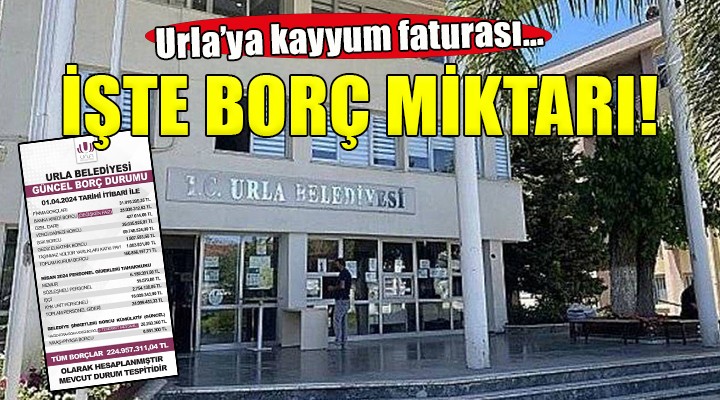 SONKALE?ZM?R-Yerel seçimde kayyum yönetiminden CHP'ye geçen Urla Belediyesi'nin toplam borcu belli oldu. Yerel seçimde yüzde 70.47'lik rekor oyla ba?kanl??a seçilen Selçuk Balkan'?n talimat? ile belediyenin mali durumu tespit edildi. Borç afi?i belediye hizmet binas?na da as?ld?.