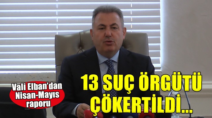 Kentte bu y?l mart ve nisan ay?nda 13 organize suç örgütünün çökertildi?ini belirten Vali Elban, geçen y?l bu rakam?n 3 oldu?unu ve yüzde 333'lük bir art?? oldu?unu kaydetti. Bu y?l mart ve nisan ay?nda geçen y?la oranla yüzde 2,35'lik art??la aranan 15 bin 973 ki?inin yakaland???na dikkati çeken vali Elban, Ayr?ca, bu iki ayda 658 tabanca, 106 tüfek, 4 uzun namlulu silah, 43 kuru s?k? tabanca, 694 kesici ve delici alet, 6 bin 528 fi?ek ele geçirildi dedi.