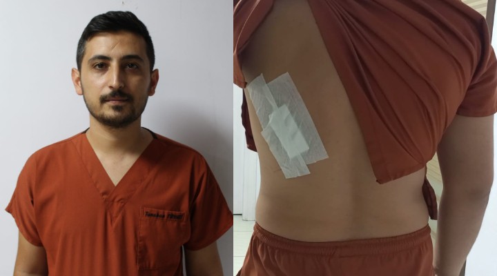 Sald?r?ya u?rayan Veteriner Hekim Tolga Tiryaki, "Bizden köpe?in diki?lerinin al?nmas?n? istedi. Biz de yard?mc? olmak istedik. Köpe?in kontrol alt?na al?nmas? zorlan?nca sinirlendi. Bize sald?rd?. Böyle bir tav?r sergileyince bizler de yard?m etmek istemedik. Bize sald?rmaya ba?lad?, kendisi yere dü?tü. Sonras?nda eve gitti, yakla??k bir metreden büyük bir odunla geri döndü ve bizlere tekrar sald?rd?. Tekrar gönderdik. Ba?ka bir sopayla geri geldi, onu da elinden ald?k. Yine arbede ç?kt?. Sonra tekrar bir b?çakla gelerek bizlere sald?rd?. Araya karde?im girdi, s?rt?ndan yaraland?. Karde?im yan tarafa kaç?nca beni kovalamaya çal??t?, arka tarafta bana yeti?emeyince b?ça?? f?rlatt?. B?çak da kalçam?n üst k?sm?na denk geldi ve bu ?ekilde yaraland?m" dedi.