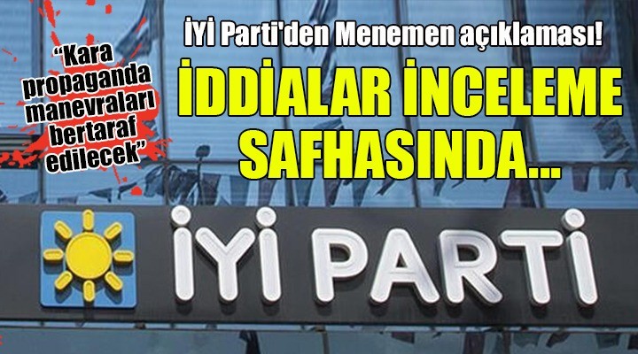 Menemen'deki soru?turmada ad? geçen ?Y? Partililere yönelik, ?Y? Parti ?zmir ?l Ba?kanl???'ndan bir aç?klama geldi. ?Y? Parti'nin ?zmir'de 14 bine yak?n üyesi ve 1500'e yak?n yöneticisi bulundu?u belirtilen aç?klamada "..Her parti üyemiz yahut yöneticimizin ticari al??veri?lerini, mesleklerini icra edi? ?ekillerini, sosyal ve ticari hayatlar?n?n her noktas?n? denetleyebilme ve müdahale edebilme zorunlulu?u olmad??? gibi, buna fiilen ve fiziken de imkan bulunmamaktad?r" denildi.