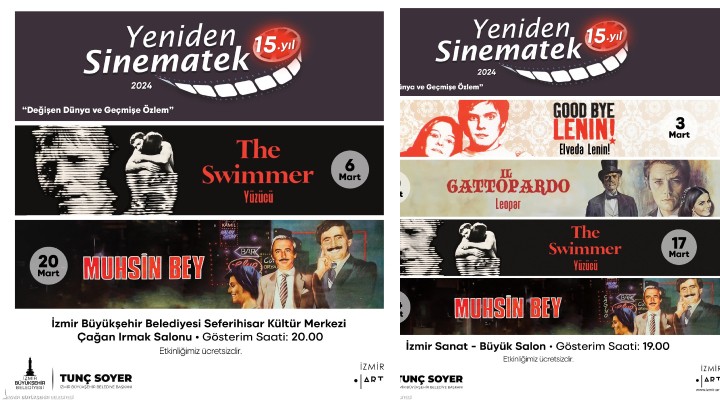 ?zmir Büyük?ehir Belediyesi dünyan?n dört bir yan?ndan sinema eserleriyle keyifli bir yolculuk yapma ?ans?n? ?zmirli sanatseverlere sunuyor. "Yeniden Sinematek" gösterimlerinde Mart ay?nda “De?i?en Dünya ve Geçmi?e Özlem” temas?yla ödüllü dört film, iki ayr? merkezde ücretsiz olarak gösterime girecek. “Elveda Lenin!”, “Leopar”, “Yüzücü ” ve “Muhsin Bey” filmleri izleyenlere unutulmayacak anlar ya?atacak. Film gösterimleri Kültürpark ?zmir Sanat ve Seferihisar Kültür Merkezi’nde ücretsiz olarak gerçekle?tirilecek. Ayr?nt?l? bilgiye