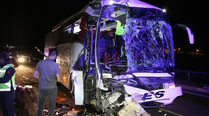 ?zmir-U?ak kara yolunda seyreden ?.Ö. (59) yönetimindeki ES Turizm'e ait 06 PK 929 plakal? yolcu otobüsü, Ç?narc?k Köyü yak?nlar?nda ayn? istikamette giden E.A. (42) idaresindeki 43 AAF 342 plakal? TIR'?n dorsesine arkadan çarpt?.