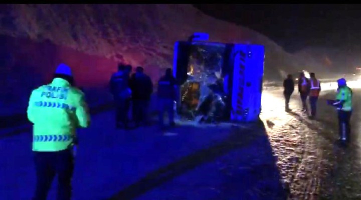 Kaza, sabah saat 05.30 s?ralar?nda Gürün ilçesi Maz?k?ran mevkisinde meydana geldi. ?stanbul-Diyarbak?r seferini yapan R.D. yönetimindeki 35 AGG 489 plakal? yolcu otobüsü, kar ya???? ve tipi nedeniyle kayganla?an yolda kontrolden ç?karak devrildi.