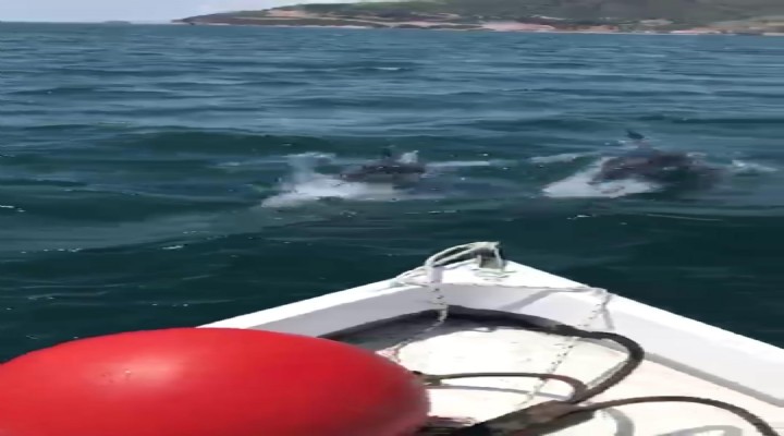 Ahmetbeyli Sahili'nden oltayla bal?k tutmak için tekneyle aç?lan amatör bal?kç? Ça?da? Edinsel ve arkada?lar?na denizden iki yunus da e?lik etti. Tekneyle yar??an yunuslar?n bu anlar?, bal?kç?lar taraf?ndan cep telefonuyla kaydedildi. Yunuslar?n tekneyle birlikte hareket etti?i anlar görsel ?ölen olu?turdu.