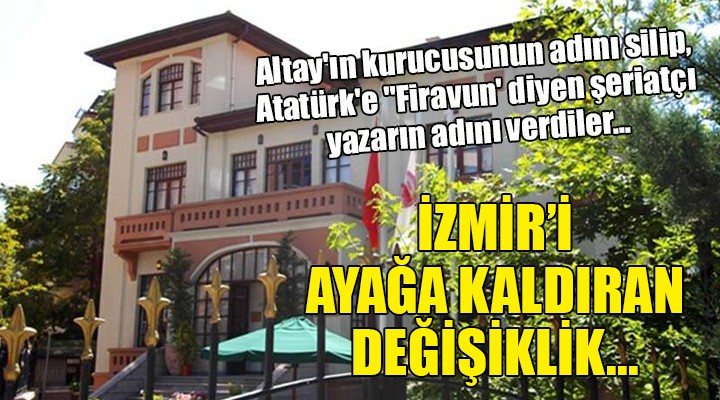 Altay'?n kurucusu Mustafa Necati Bey'in ad?n? ta??yan Kültür Evi'ne, Atatürk'e "Firavun" diyen ?eriatç? yazar Nuri Pakdil'in isminin verilmesi ?zmirliler'i aya?a kald?rd?. Altayl? taraftarlar, de?i?ikli?in düzeltilmesi için imza kampanyas? ba?lat?rken, ?Y? Parti ?zmir Milletvekili Aytun Ç?ray da duruma tepki gösterdi. Ç?ray, "?zmirliler olarak bunu ?iddetle reddediyoruz" dedi