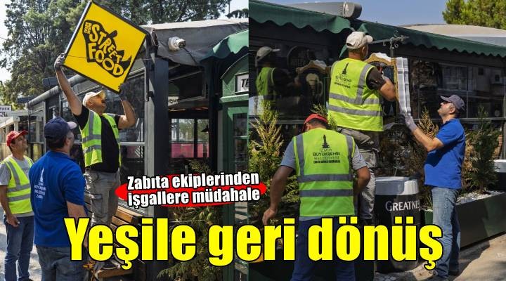 ?zmir Büyük?ehir Belediyesi Zab?ta Dairesi Ba?kanl??? Denetim ?ube Müdürlü?ü ekipleri, Güzelyal?’daki i?letmeler taraf?ndan hizmet alan?na çevrilen ye?il alanlara yönelik çal??ma yürüttü. Bölge esnaf?n?n da i? birli?i ile ye?il alanlardaki i?galler kald?r?ld?. Söz konusu alanlar Park ve Bahçeler Dairesi Ba?kanl??? taraf?ndan düzenlenerek yeniden halk?n kullan?m?na sunulacak