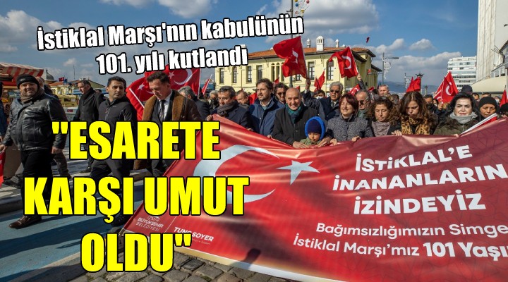 ?zmir Büyük?ehir Belediyesi ba??ms?zl?k mücadelesinin simgesi ?stiklal Mar??'n?n kabulünün 101. y?l?n? Konak Atatürk Meydan?'nda düzenledi?i törenle kutlad?. Tören öncesinde ?zmirliler, ?zmir Büyük?ehir Belediyesi Bandosu e?li?inde Cumhuriyet Meydan?'ndan Konak Atatürk Meydan?'na yürüdü. Korteje ?zmir Büyük?ehir Belediye Ba?kan? Tunç Soyer, CHP ?zmir ?l Ba?kan? Deniz Yücel, Konak Belediye Ba?kan? Abdül Batur, Foça Belediye Ba?kan? Fatih Gürbüz, Güzelbahçe Belediye Ba?kan? Mustafa ?nce, Balçova Belediye Ba?kan? Fatma Çalkaya, Karaburun Belediye Ba?kan? ?lkay Girgin Erdo?an, ?zmir Kent Konseyi Ba?kan? Prof. Dr. Adnan O?uz Akyarl?, siyasi partilerin temsilcileri, ?zmir Büyük?ehir Belediyesi’nin bürokratlar?, meclis üyeleri, sivil toplum kurulu?lar?n?n, odalar?n ve derneklerin temsilcileri, muhtarlar ve yurtta?lar kat?ld?.