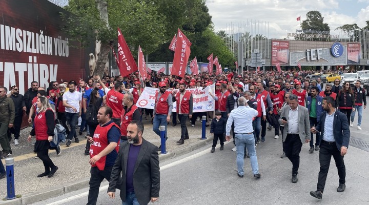 Devrimci ??çi Sendikalar? Konfederasyonuna (D?SK) ba?l? Genel-?? ?zmir 2 ve 9 nolu ?ube üyeleri, Basmane Meydan?'ndan ?irketin Hürriyet Bulvar?'ndaki binas? önüne kadar yürüdü.