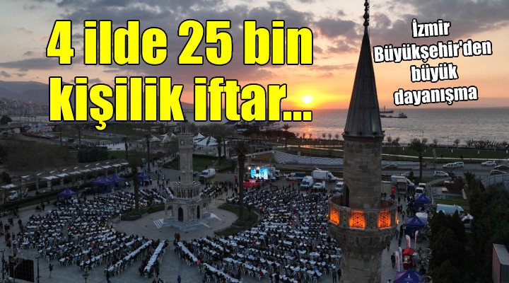 Meydanda yap?lan iftarla e? zamanl? olarak 10 Biz ?zmir dayan??ma noktas?, 3 mobil a?evi ve Osmaniye, Ad?yaman ve Hatay'da toplamda 25 bin ki?i ?zmir Büyük?ehir Belediyesi'nin sofras?nda iftar?n? açt?.