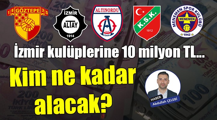 Payla??m konusunda ?ZVAK'?n önceki dönemlerde yapt??? uygulamalar?n uygulanaca?? ö?renildi. Buna göre Süper Lig'de yer alan Göztepe'ye 4 birim, 1. Lig'deki Altay, Alt?nordu ve Menemenspor'a 2 birim, 3. Lig'deki Kar??yaka'ya 1 birim, Bölgesel Amatör Lig'de yer alan Bucaspor, ?zmirspor ile Bergama'ya ise yar?m birim ödenece?i belirtildi. 10 milyon TL para 12.5 birim olarak hesaplan?rken bir birim 800 bin TL'ye tekabül edecek. Buna göre: