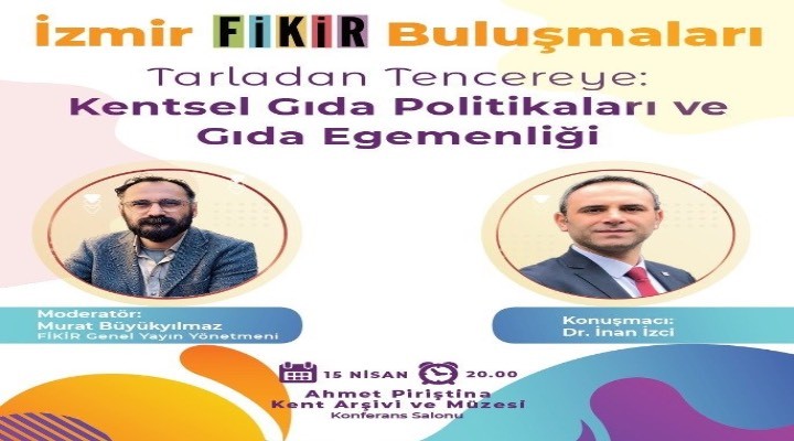 ?zmir Büyük?ehir Belediyesi’nin ‘?zmir F?K?R Bulu?malar?’ dizisinin yeni oturumu, 15 Nisan Çar?amba günü saat 20.00’de Ahmet Piri?tina Kent Ar?ivi ve Müzesi Konferans Salonu’nda gerçekle?tirilecek. Dr. ?nan ?zci’nin konu?mac?, F?K?R Genel Yay?n Yönetmeni Murat Büyüky?lmaz’?n moderatör olarak yer alaca?? bulu?mada, kentsel g?da politikalar? ve g?da egemenli?i ba?l??? etraf?nda ?zmir’in güncel ihtiyaçlar?, imkânlar? ve tart??ma alanlar? de?erlendirilecek. 17 Nisan Uluslararas? Çiftçi Mücadeleleri Günü’nün açt??? tarihsel ve siyasal çerçeveden hareket eden oturum, tar?m? yaln?zca ekonomik bir sektör olarak de?il emek, ya?am, g?da hakk?, ekoloji ve demokrasi meselesi olarak birlikte dü?ünmeyi amaçl?yor. Bu yönüyle bulu?ma, çiftçi mücadelelerinin dünyadaki ve Türkiye’deki birikimini ?zmir’in güncel gerçekli?iyle bulu?turmay? hedefliyor.
