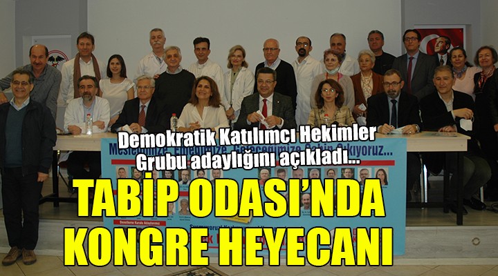 SONKALE?ZM?R-?zmir Tabip Odas? 'nda Hekim Güçbirli?i Grubu ad?na Prof. Dr. Çimen Gülben Olguner'in adayl???n? aç?klamas?n?n ard?ndan, Demokratik Kat?l?mc? Hekimler Grubu da yönetime talip oldu. ?lk oturumu 10 Nisan'da, seçimlerin ise 17 Nisan'da yap?laca?? kongre öncesi Demokratik Kat?l?mc? Hekimler Grubu'nun yönetim kurulu üyeleri ?zmir Tabip Odas?'n?n Alsancak'taki binas?nda bas?n toplant?s? ile tan?t?ld?.