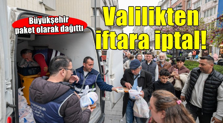 ?zmir Büyük?ehir Belediye Ba?kan? Dr. Cemil Tugay’?n ramazan ay?nda birlikteli?i, bereketi, dayan??may? büyütmek için 30 ilçeyi kapsayan iftar bulu?malar? Konak'ta yap?lamad?. Kemeralt? Milli Kütüphane Caddesi'nde düzenlenecek iftar bulu?mas? ülkede ya?anan süreç gerekçe gösterilerek ?zmir Valili?i karar?yla iptal edildi. Haz?rlanan 4 bin ki?ilik s?cak iftarl?k ?zmir Büyük?ehir Belediyesi ekipleri taraf?ndan esnaf ve yurtta?a ula?t?r?ld?.