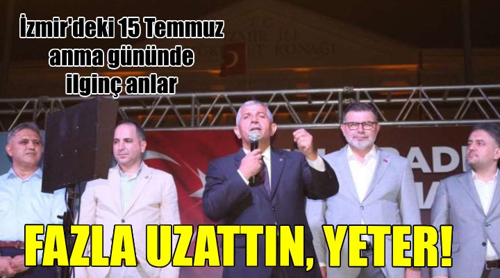 Programda ba?kanlar tek tek konu?ma yaparken, Gelecek Partisi ?zmir ?l Ba?kan? Onur Sivasl?, "15 Temmuz'da bu meydanda mücadele eden genç karde?imizi bugün de milletvekili olarak bu meydanda gördük. Sizi övüyorum ama yar?n yine muhalefet ederiz" diye konu?tu. Sivasl?, Ahmet Davuto?lu ve di?er partililerin selamlar?n? ?zmir halk?na ilettikten sonra "Laf? fazla uzatt?m biliyorum ama selamlar üzerimde kals?n istemiyorum" ifaderi üzerine sahnede yan?nda bulunan MHP ?zmir ?l Ba?kan? Veysel ?ahin, eliyle Sivasl?'ya "Fazla uzatt?n yeter, yeter, bu kadar yeter" ç?k???nda bulundu.