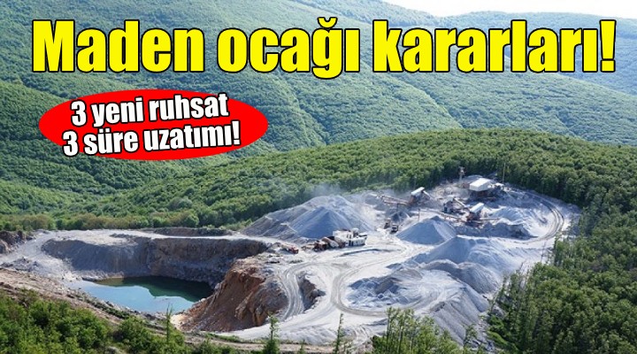 Komisyon, ?zmir'deki 3 maden oca??n?n süre uzat?m talebini de karar ba?lad?. Buna göre Bergama’da Sedat ?engül’e ait granit oca??n?n, Alia?a’da BZLT Madencilik ?irketi’ne ait bazalt oca??n?n ve Bornova’daki Çimenta?’a ait kalker oca??n?n madencilik faaliyeti süresi uzat?ld?.