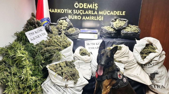 Narkotik Suçlarla Mücadele ?ube Müdürlü?ü, Ödemi? Narkotik Büro Amirli?i ve ?stihbarat ?ube Müdürlü?ü ekipleri, Kiraz ilçesinin Çömlekçi mevkiinde ya?ayan C.B.'nin evinde, hayvan dam?nda ve bahçesinde uyu?turucu madde bulundu?unu tespit etti. Önceki gün adrese yap?lan operasyonda 38 kilo 750 gram esrar, 750 kök Hint keneviri ve 1 adet hassas terazi ele geçirildi. C.B. gözalt?na al?nd?. Polisteki i?lemlerinin ard?ndan adliyeye sevk edilen C.B. tutukland?.