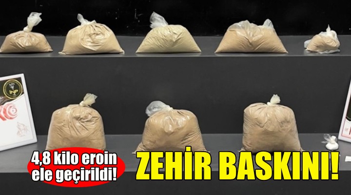 Evdeki aramalarda 4 kilo 838 gram eroin, 11 gram kokain ve 2 hassas terazi ele geçirildi.