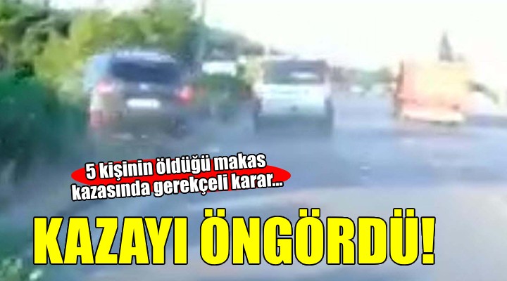 Kaza, geçen y?l 30 Haziran'da saat 19.30 s?ralar?nda K?s?k Mahallesi ?zmir-Ayd?n kara yolunda meydana geldi. Gaziemir'den Ayranc?lar yönüne giden Özcan Özer (57) yönetimindeki, içinde 11 ki?inin bulundu?u 34 DEB 698 plakal? otomobile, Yusuf ?slam Koçak'?n kulland??? 35 ADF 564 plakal? hafif ticari araç yandan çarpt?. Özer'in kontrolünü yitirdi?i otomobil, refüjü a?arak kar?? yönden gelen ?smail Akdar'?n kulland??? 09 BU 404 plakal? yolcu minibüsüyle çarp??t?. Kazada sürücü Özcan Özer, arac?ndaki Sibel Özer (54), ?engül Akba? (64), sürücünün o?lu Ali Alperen Özer (18) ile minibüste yolcu olan Mustafa Kemal Karaca (86) ya?am?n? yitirdi. Özer yönetimindeki otomobilde bulunan Seren Öner, Hatice Beren Öner, Ayaz Efe Kazaker, Deniz Kazaker, Do?a Kazaker, Yi?it Özer ve Çiçek Akba, minibüsteki yolcular Mete Akba, Hatice Kama, Fatma Tüntan?r, Belgin Harzad?n, H?d?r Kama, Chen Tseng, Erdem Çeven, Azra Çeven, Esra Tarkan, Hüsniye Ay?e Mara?, Kuzey Kalabak, Cehn Chingi Ju ve Sacide Karaca yaraland?. Yaral?lar, tedavilerinin ard?ndan taburcu edildi.