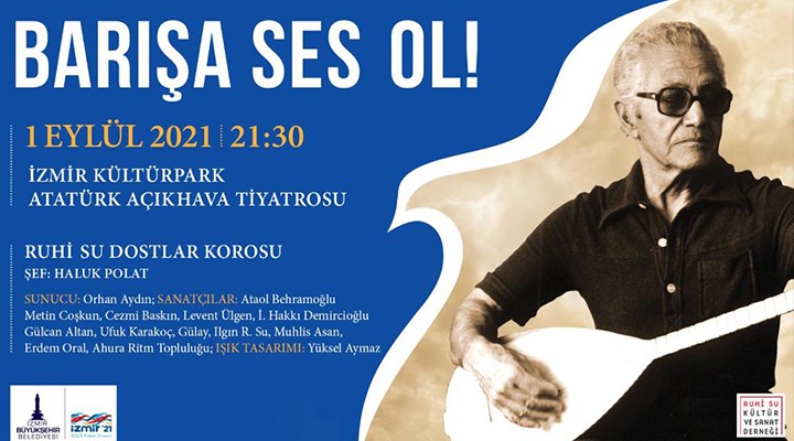 ?zmir Büyük?ehir Belediyesi 1 Eylül’de “Bar??a Ses Ol” konseri düzenliyor. Kültürpark Atatürk Aç?khava Tiyatrosu'nda yap?lacak konserde Ruhi Su Dostlar Korosu sahnede olacak. Ücretsiz konser 21.30’da ba?layacak.