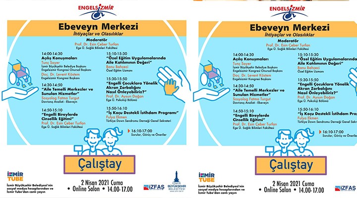 ?zmir Büyük?ehir Belediyesi pandemi nedeniyle ileri bir tarihe ertelenen 4. Engelsizmir Kongresi’nin haz?rl?k çal??malar? kapsam?nda Tarihi Havagaz? Fabrikas? Kültür Merkezi'nde "Ebeveyn Merkezi, ?htiyaçlar ve Olas?l?klar Çal??tay?" düzenliyor. 2 Nisan Dünya Otizm Fark?ndal?k Günü’nde düzenlenecek çal??tay, engelli haklar?n? kapsay?c? bir içeri?e sahip. Çal??tayda ?zmir Büyük?ehir Belediyesi bünyesinde kurulacak Ebeveyn Merkezi’nin uzmanlar? da konu?mac? olarak yer alacak.