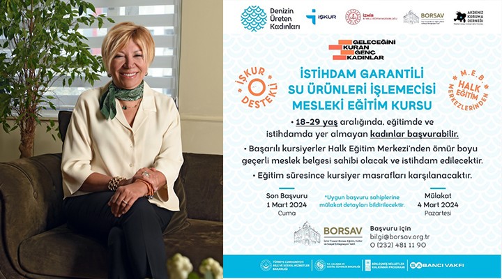 ?zmir Ticaret Borsas? E?itim, Kültür ve Sosyal Entegrasyon Vakf? (BORSAV) ile Akdeniz Koruma Derne?i ortakl???nda “Denizin Üreten Kad?nlar?” Projesi’nin i? garantili meslek kursu ba?l?yor. ??KUR deste?i ile Halk E?itim Merkezleri üzerinden 23 günlük kurs ile kad?nlar su ürünleri i?lemecisi meslek belgesi alacak. Kursu ba?ar?yla tamamlayan kad?nlar kurs gördükleri i?letmelerde do?rudan i?e ba?lama imkan?na sahip olacaklar.