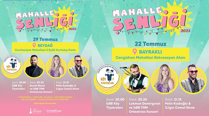 ?zmirli yurtta?lar, ?zmir Büyük?ehir Belediyesi Kültür ve Sosyal ??ler Dairesi Ba?kanl??? organizasyonunda düzenlenecek Mahalle ?enli?i ile e?lenceli etkinliklerle bulu?acak. Mahalle ?enli?i, 22 Temmuz’da Bayrakl? Cengizhan Mahallesi Rekreasyon Alan?, 29 Temmuz’da Beyda? Cumhuriyet Mahallesi 2 Eylül Kurtulu? Park?, 5 A?ustos’ta Bergama Cumhuriyet Meydan?, 12 A?ustos’ta Ödemi? Kültürpark Zafer Mahallesi, 19 A?ustos’ta Kemalpa?a Rekreasyon Alan? ve 26 A?ustos’ta Alia?a Siteler Mahallesi ?ehit O?uz Özgür Çevik Park?’nda gerçekle?tirilecek.
