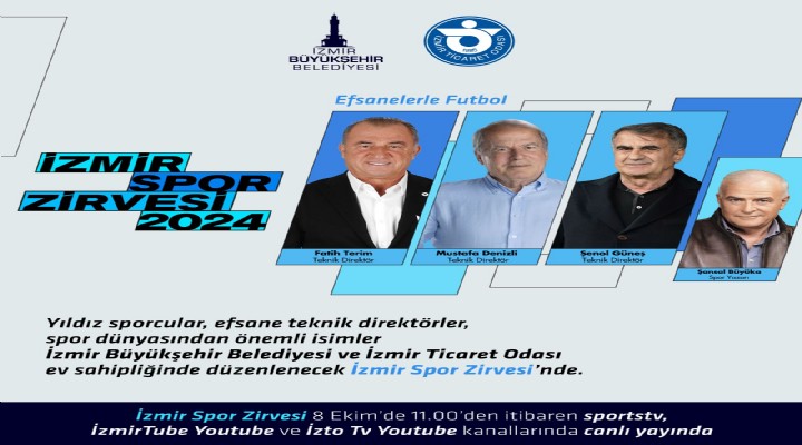 ?zmir Büyük?ehir Belediyesi ile ?zmir Ticaret Odas? (?ZTO) i? birli?iyle 8 Ekim’de Ahmed Adnan Saygun Sanat Merkezi’nde (AASSM) düzenlenecek “?zmir Spor Zirvesi”nin program? belli oldu. Türkiye’nin y?ld?z sporcular?n?n, efsane teknik direktörlerinin ve spor dünyas?n?n önemli isimlerinin kat?laca?? zirve Eski Gençlik ve Spor Bakan? ?zmir Milletvekili Dr. Mehmet Kasapo?lu, ?zmir Valisi Dr. Süleyman Elban, ?zmir Büyük?ehir Belediye Ba?kan? Dr. Cemil Tugay ve ?zmir Ticaret Odas? Yönetim Kurulu Ba?kan? Mahmut Özgener’in aç?l?? konu?malar?yla ba?layacak. Zirvede olimpik sporculardan spor yazarlar?na milli voleybolculardan Fatih Terim, Mustafa Denizli ve ?enol Güne? gibi efsane teknik direktörlere kadar çok say?da isim ?zmirliler ile bulu?acak.