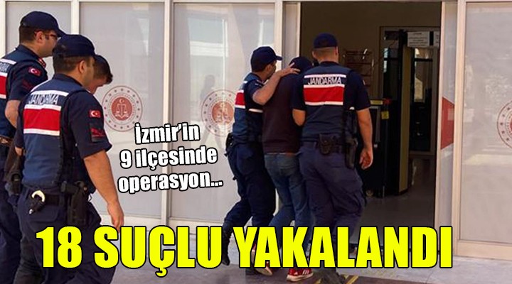 Torbal?, Ödemi?, Dikili, Seferihisar, Çi?li, Alia?a, Tire, Beyda? ve Kiraz olmak üzere 9 ilçede yap?lan operasyonlarda "H?rs?zl?k", "Çocu?un cinsel istismar?", "Uyu?turucu veya uyar?c? madde ticareti yapma veya sa?lama", "Birden fazla ki?i taraf?ndan silahl? ya?ma", "Ki?iyi hürriyetinden yoksun k?lma ile "Kasten yaralama" gibi suçlardan aranan 18 ki?i yakaland?.