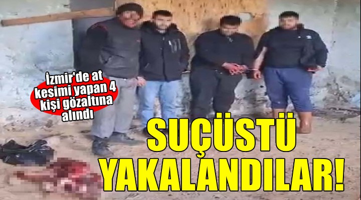 Olay, 23 ?ubat'ta Konak ilçesi Hilal semtindeki metruk bir evde meydana geldi. Polis, at kesimi yap?ld??? ihbar üzerine adrese operasyon düzenledi. Kaçak kesim yapt??? belirlenen Mert Ö. (42), Abdülbaki Ö. (24), Cani ?. (24) ile A.Ö. (16) polis ekipleri taraf?ndan gözalt?na al?nd?. Adreste yap?lan aramalarda kesilen at parçalar? da bulundu. Savc?n?n talimat?yla A.Ö. ailesine teslim edildi. Emniyetteki i?lemlerinin ard?ndan adliyeye sevk edilen 3 ?üpheli ise adli kontrol ?art?yla serbest b?rak?ld?. ?üphelilerin, etleri ramazan ay? öncesi piyasaya sürmeye haz?rland?klar? ö?renildi.