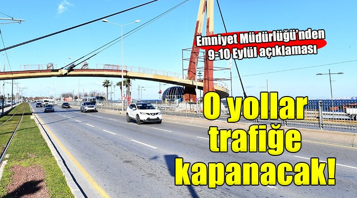 ?zmir Emniyet Müdürlü?ü'nden yap?lan aç?klamaya göre, 9 Eylül'de "Zafer Yürüyü?ü" kapsam?nda 08.00-10.00 saatlerinde Anafartalar Caddesi, Gazi Osman Pa?a Bulvar? ve E?refpa?a Caddesinin bir bölümü kontrollü bir ?ekilde araç trafi?ine kapat?lacak.