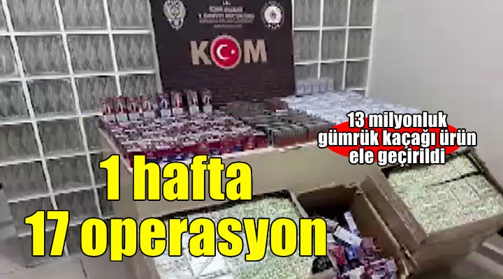 Bayrakl?, Buca, Gaziemir, Karaba?lar, Konak, Menemen, Narl?dere ve Ödemi? ilçelerinde; 3 ev, 4 i?yeri, 3 araç, 2 depo ve 5 kargo gönderisinde yap?lan aramalarda piyasa de?eri yakla??k 13 milyon TL de?erinde 4 bin 479 ?i?e muhtelif içki, 4 bin 577 litre taklit etiketli etil alkol, 3 bin 792 paket gümrük kaça?? sigara, 2 bin 800 adet içi doldurulmu? makaron, 184 bin 320 yaprak sigara ka??d?,21 gümrük kaça?? cep telefonu, 4 bin 765 gümrük kaça?? elektronik ürünü, 44 gümrük kaça?? parfüm, 99 bin 956 adet sahte parfüm imalat?nda kullan?lan malzeme, 326 elektronik sigara cihaz?, 19 sikke, 1600 litre kar???ml? akaryak?t ürünü, 1 gümrük kaça?? otomobil ele geçirildi.