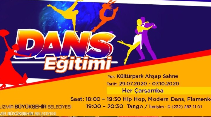 ?zmir Büyük?ehir Belediyesi dans tutkunlar?n? usta e?itmenlerle bulu?turuyor. Büyük?ehir Belediyesi taraf?ndan düzenlenen hip hop, modern dans, flamenko ve tango alanlar?ndaki dans e?itimleri bugün Kültürpark Ah?ap Sahne’de ba?l?yor. Dersler ücretsiz olacak ve 7 Ekim’e kadar sürecek. Kat?l?m için kay?t ?art? aranm?yor, derslerin kap?lar? kat?lmak isteyen herkese aç?k.