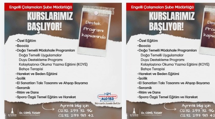 Engelli yurtta?lara yönelik pek çok etkinlik gerçekle?tiren ?zmir Büyük?ehir Belediyesi Engelli Çal??malar? ?ube Müdürlü?ü, Destek Program? kapsam?nda kurslar da düzenliyor. Özel E?itim, Boccia, Hareket ve Beden E?itimi, ?zcilik, El Sanatlar? Tak? Tasar?m? ve Ah?ap Boyama, Seramik, Ritim ve Dans, Spora Özgü Temel E?itim ve Hareket ile Do?a Temelli Uygulamalar, Duyu Destekleme Program?, Kolayla?t?r?c? Okuma Yazma E?itimi ve Bahçe Terapisi olmak üzere Do?a Temelli Müdahale Programlar? kurslar? ba?l?yor. Kurslara 18 Ekim tarihine kadar ba?vuru al?nacak. Ayr?nt?l? bilgi 232 293 32 96 ve 232 293 98 42 numaral? telefonlar arac?l??? ile al?nabiliyor.