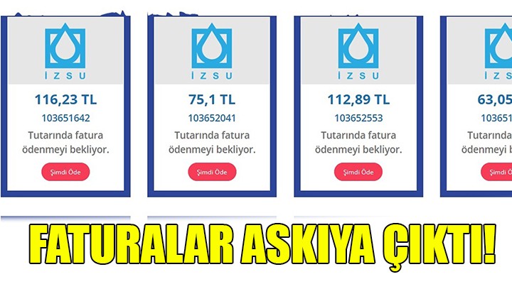 ?zmir Büyük?ehir Belediyesi, koronavirüs salg?n? nedeniyle ba?latt??? dayan??ma sürecini “ask?da fatura” uygulamas?yla sürdürüyor. Bu dönemde i?ini, gelirini kaybeden, ekonomik zorluklarla mücadele eden kesimlere destek olunmas? amac?yla önce ?stanbul’da ba?layan uygulama ?imdi de ?zmir’e ta??nd?. Ayl?k su faturalar?n? ödeyemeyenler ile onlar?n yerine ödemek isteyenlerin bulu?ma adresi ise www.bizizmir.com oldu.