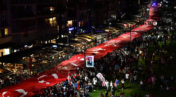 ?zmir’in dü?man i?galinden kurtulu?unun 97’inci y?ldönümü ?zmir Büyük?ehir Belediyesi taraf?ndan düzenlenen birbirinden farkl? etkinliklerle kutland?. 9 Eylül günü sabah saatlerinden itibaren ba?layan kutlama program? ak?am fener alay? ile devam etti. Cumhuriyet Meydan?’nda ba?lay?p Lozan Kap?s?’nda son bulan Fener Alay?’na kat?lan ?zmir Büyük?ehir Belediye Ba?kan? Tunç Soyer vatanda?larla birlikte yürüdü. ?zmir Büyük?ehir Belediyesi Bandosu’nun mar?lar? e?li?inde 350 metrelik Türk bayra??n? gururla ta??yan ?zmirliler, ellerindeki bayraklar? sallayarak Kordon’u adeta gelincik tarlas?na çevirdi.