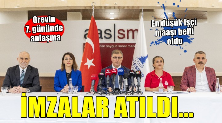 ?zmir Büyük?ehir Belediyesi ile Devrimci ??çi Sendikalar? Konfederasyonu (D?SK) Genel ?? Sendikas? ?zmir 1 ve 3 No'lu ?ubeler aras?nda yürütülen toplu i? sözle?mesi görü?melerinde uzla?maya var?ld?. ?zmir Büyük?ehir Belediye Ba?kan? Dr. Cemil Tugay, sözle?meyi D?SK Genel ?? 1 No'lu ?ube Ba?kan? Engin Topal ile 3 No'lu ?ube Ba?kan? Serap Y?lmaz'?n yan? s?ra CHP Genel Ba?kan Yard?mc?s? Gamze Ta?ç?er'in kat?l?m?yla Ahmed Adnan Saygun Sanat Merkezi'nde (AASSM) imzalad?.