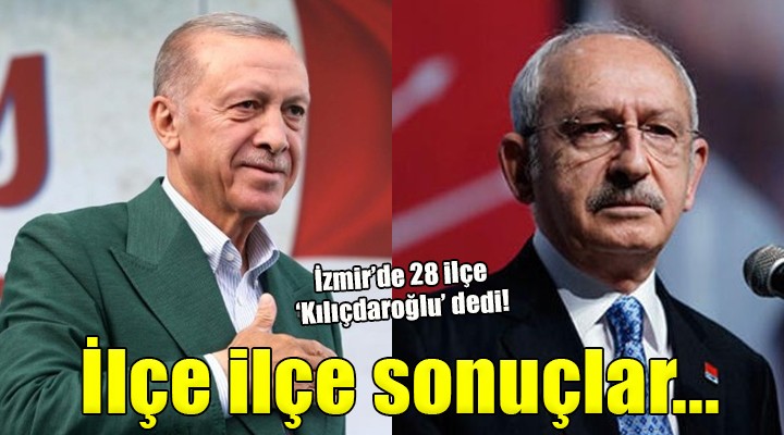 SONKALE?ZM?R-?zmir'in 30 ilçesinde kesin olmayan sonuçlara göre K?l?çdaro?lu 28, Erdo?an ise 2 ilçede yar??? önde bitirdi. ??te ilçe ilçe seçim sonuçlar?