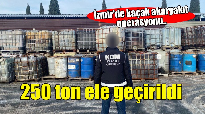 ?zmir'deki bir depoya yap?lan bask?nda, piyasa de?eri yakla??k 10 milyon TL oldu?u belirtilen, plastik ve metal tanklar içerisinde toplam 250 ton kar???ml? akaryak?t ürünü ele geçirildi.