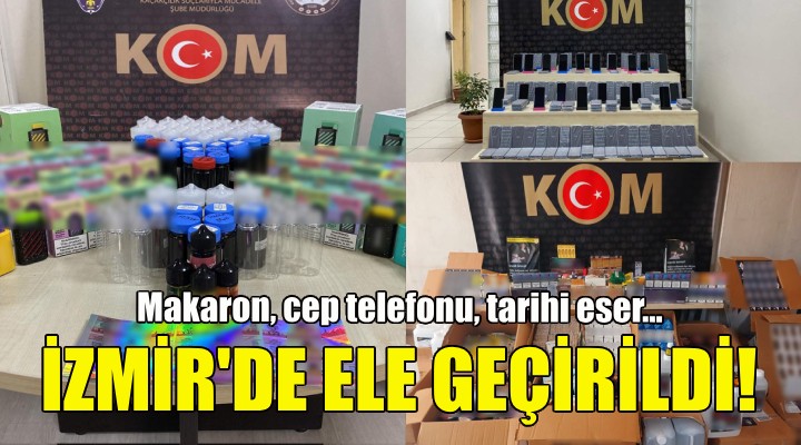 Adreslerde yap?lan aramalarda 327 bin 100 adet doldurulmu? makaron, 44 bin 600 bo? makaron, 605 litre taklit etil alkol, 543 paket kaçak sigara, 500 litre kaçak akaryak?t, 295 elektronik sigara, 270 ?i?e muhtelif içki, 253 cinsel içerikli ürün, 172 adet gümrük kaça?? cep telefonu, 27 kilogram tütün ve 13 tarihi eser ele geçirildi.