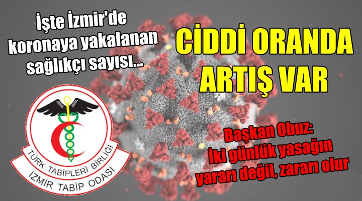 Tabip Odas?, ?zmir'de koronavirüse yakalanan sa?l?k çal??anlar?yla ilgili son verileri payla?t?. Bir hafta önce 111 olan vaka say?s? 266'ya yükselirken ?zmir Tabip Odas? Ba?kan? Funda Barl?k Obuz, "Ciddi bir yükseli? görülüyor. Sa?l?k çal??anlar?na rutin olarak haftal?k test yap?lmas? için gayretimiz sürüyor. ?zmir'de henüz bunu sa?lam?? de?iliz" dedi. Obuz, iki günlük soka?a ç?kma yasa?? ile ilgili olarak da "Faydas?ndan çok zarar? olur. En az 15 gün yap?lmal?" dedi