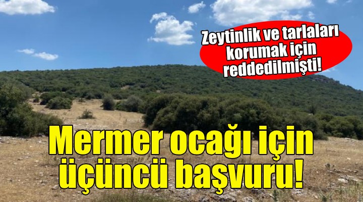 Bu geli?me üzerine firma, mermer kesme ve i?leme tesisini projeden ç?karm??, proje alan?n? da bir miktar küçülterek sadece sulu kesim tel kesme yöntemi ile blok mermer üretimi gerçekle?tirmek için yeniden ÇED ba?vurusu yapm??t?. Bu ba?vuru da proje alan?nda ve yak?n çevresinde yayg?n olarak yabani zeytin a?açlar? oldu?u, proje alan? s?n?r?ndaki ve yak?n?ndaki ovalarda verimli tarlalar ile meyve ve zeytin bahçeleri bulundu?u gerekçesi ile iptal edilmi?ti.