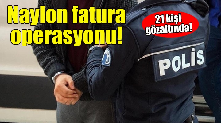 Kaza sigorta tazminat?n? hileli yollarla elde ettikleri tespit edilen 12, paravan ?irketler arac?l??? ile naylon fatura düzenleyerek bu faturalar? piyasaya para kar??l??? sürdükleri belirlenen 12 olmak üzere toplam 24 ?üpheli için gözalt? karar? verildi. ?zmir merkezli, Ayd?n ve Manisa'da toplam 19 ev ve 10 i? yerinde vergi denetim memurlar?n?n da kat?l?m?yla düzenlenen operasyonda 21 ?üpheli yakalanarak gözalt?na al?nd?. Ev ve i? yerinde yap?lan aramalarda 2 tüfek, 7 fi?ek, 2 senet, 2 milyon lira de?erinde fatura, 6 fi? koçan? (300 yaprak), 2 farkl? firmalara ait pos cihaz? ele geçirildi. ?üphelilerin emniyetteki i?lemlerinin sürdü?ü belirtilirken, 3 firari ?üpheliyi yakalamak için çal??malar?n devam etti?i bildirildi.
