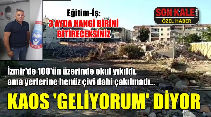 SONKALE?ZM?R (ÖZEL)- Yeni e?itim ö?retim dönemine k?sa bir süre kala, 30 Ekim 2020 depreminde 117 ki?inin hayat?n? kaybetti?i ve binlerce binan?n hasar gördü?ü ?zmir'de okul sanc?s? ya?an?yor. Deprem öncesinde ve sonras?nda bo?alt?lan 100'ün üzerinde okul binas?n?n ?uan kullan?lamaz halde oldu?unu aktaran E?itim- ?? Sendikas? ?zmir 1 No'lu ?ube Ba?kan? Adem Y?ld?r?m, 2022-2023 e?itim ö?retim y?l?nda ?zmir'i bir kaos bekledi?ini söyledi.